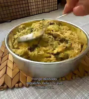 Misture o frango desfiado, requeijão, brócolis e ovo. Ajuste o sal. |