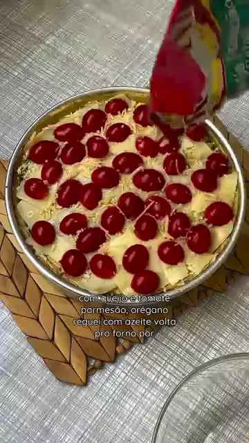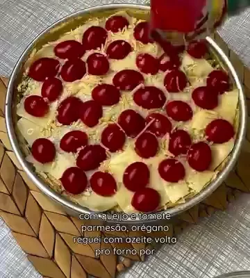 Distribua o recheio sobre a base de batata pré-assada. Cubra com queijo, tomate, parmesão e orégano. Regue com azeite. |